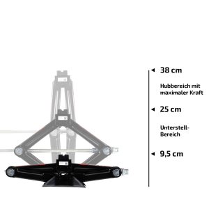 Potrivit pentru autoturisme mici pana la clasa de lux cu o greutate totala de pana la 2,1 t; Tampon robust din cauciuc cu miez metalic de 4 mm (aprox. 35×50 mm); Domeniu de ridicare: 104-380 mm; Greutate: aproximativ 2,5 kg; Cu sac de depozitare; Poate fi folosit cu mufa de 17 mm Se poate utiliza pana la temperaturi de -50 ° C Manevrabilitate ?i stabilitate excelente Tija de antrenare stabila cu maner Sa rotativa Se poate ridica de la 250 mm pana la 380 mm.