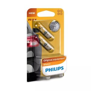 Setul de 2 becuri 12V H6W Bax9S Vision de la Philips asigura o iluminare clara si fiabila pentru semnalizare si alte aplicatii auto. Cu un design optimizat pentru durabilitate si performanta, acest set este ambalat in blister pentru o instalare simpla si rapida. Ideal pentru imbunatatirea vizibilitatii si sigurantei.