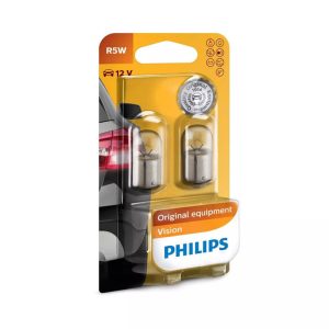 Set 2 Becuri Auxiliare R5W Ba15S 12V (Blister) Philips – Acest set contine 2 becuri auxiliare R5W, cu soclu Ba15S si tensiune de 12V. Livrate in blister, aceste becuri sunt fabricate de Philips si sunt ideale pentru aplicatii de iluminare suplimentara. Ofera o performanta fiabila si o iluminare clara, perfect pentru vehicule si echipamente care necesita lumina auxiliara.